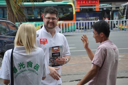 迪肯大學(xué)MBA學(xué)員在街頭推薦春光椰糖試吃