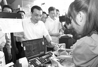 李克強(qiáng)隨機(jī)走進(jìn)??谄虏┞芬患倚〉?,了解本地產(chǎn)品種類銷售等情況