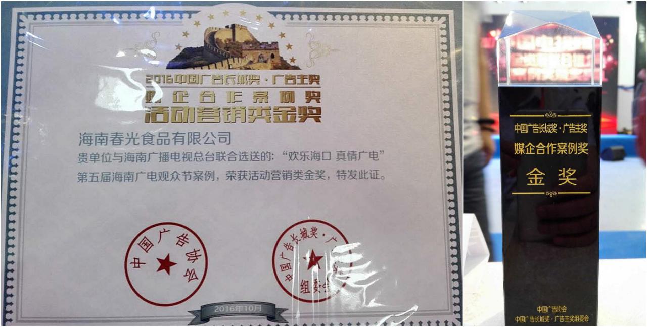 在海南國際會展中心舉辦的第23屆中國國際廣告節(jié)于24日閉幕。舉辦期間人氣爆棚,熱鬧非凡。值得一提的是,在中國廣告長城獎·廣告主獎·媒企合作案例獎(以下簡稱“媒企合作案例獎”)頒獎典禮上,海南特產(chǎn)老字號品牌春光食品榮獲了“媒企合作案例金獎”,系本屆廣告節(jié)唯一獲獎的海南企業(yè)。一直以來,春光食品品牌營銷意識及動作可謂在海南企業(yè)前茅,不斷嘗試創(chuàng)新多種營銷方式,并且都很成功地使其形象和海南椰子文化得到廣泛推廣。